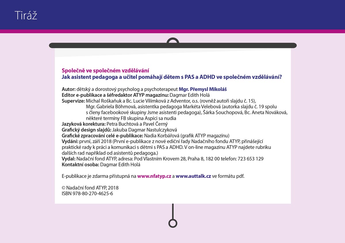 Společné vzdělávání je citlivá věc. Vyžaduje spolupráci dítěte, rodičů, asistenta pedagoga, třídního učitele, ostatních učitelů i ředitele školy a odvahu, odhodlání, optimismus a podporu všech zúčastněných. Doufáme, že takovou podporu by mohla přinést brožura Společně ve společném vzdělávání, kterou připravil zkušený psycholog pan Přemysl Mikoláš, tým magazínu Atyp a Nadačního fondu AutTalk díky podpoře NF Avast.