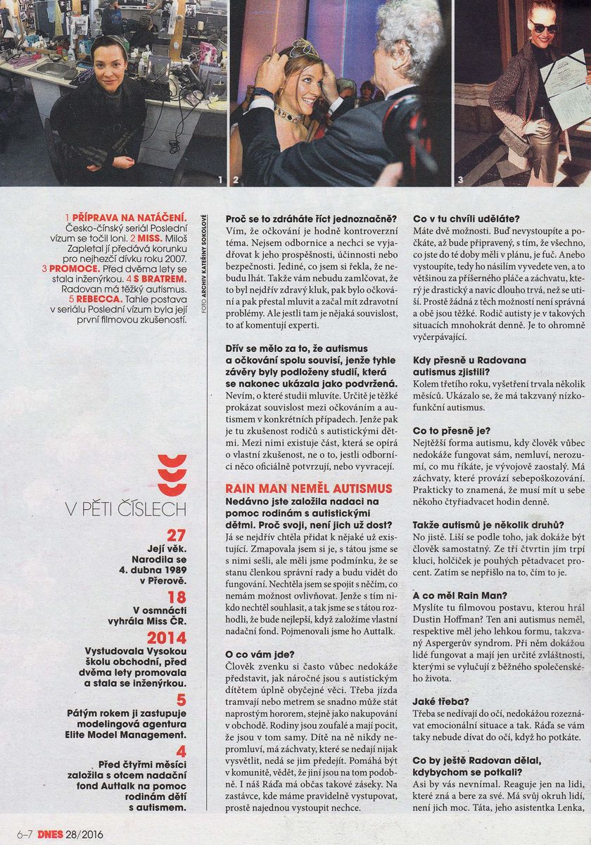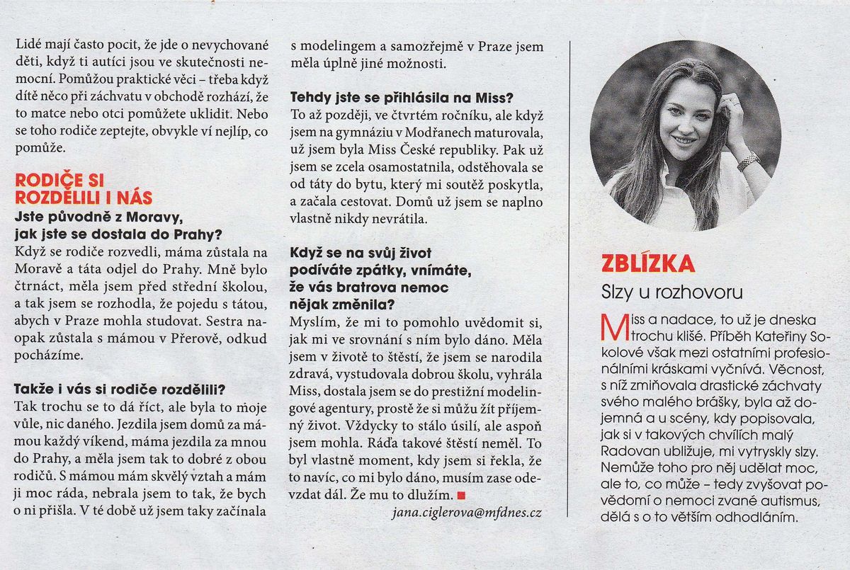 Miss ČR 2007 Kateřina Sokolová (27) pro Magazín DNES promluvila o autismu svého bratra Radovana (8). Nedokáže prý s určitostí říct, jestli postižení souvisí s očkováním, ale projevilo se právě po něm.